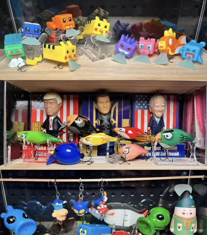 皮卡丘,奥特曼,特朗普,拜登,二次元老婆,肌肉车,甚至还有一些根本说不清是在钓鱼还是在发癫的联名款,全部挂着三叉钩,堂而皇之地开始混在那堆仿生饵里。前一秒还是小鱼小虾,后一秒直接变成卡通角色下水服役。整个柜子有点游离在专业钓具展示之外,反而像奇趣蛋吃多了集的。